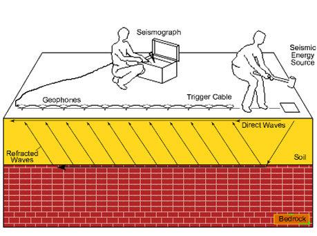 The seismic refraction method is based on the measurement of the travel time of seismic waves refracted at the subsurface layer's interfaces due to dielectric contrast. Seismic energy is generated on surface by a source ('shot' using Hammer & Plate, weight drop or small explosive charge).