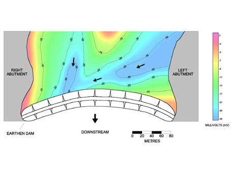 In SP Surveys voltages caused by the flow of fluid through the porous medium and ion exchange between the fluid and surrounding soil are measured. The anomalies in the voltage are mapped to obtain information on the location, flow intensity, depths and geometry of sub-surface flow routes. Using the SP Surveys the maps of the flow paths are prepared for treatment of leakage or seepages in the engineering structures. Post treatment, such as grouting etc, the SP Surveys is repeated to assess the effectiveness of the treatment and map the seepage / leakage, if any.